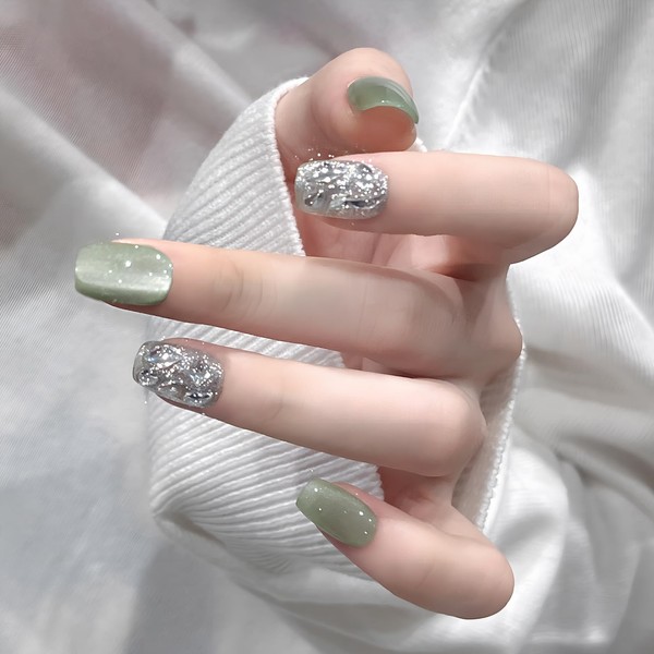 [NEURAD]ネイルチップ 30枚入マグネットタイプ マスカットミルクグリーン キャットアイ × スワロフスキー付け爪 夏向けショートネイル 人気 和風 かわいい 花嫁ネイル