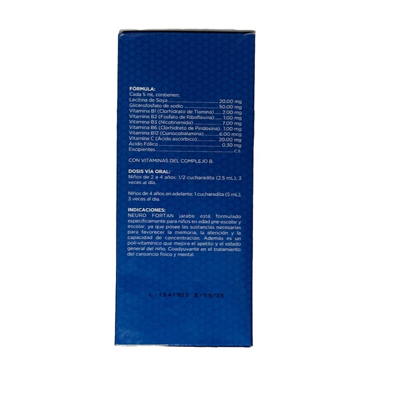 NEURO FORTAN syrup is specifically formulated for children of preschool and school age, since it has the necessary substances to promote memory, attention and the ability to concentrate. It is also a poly-vitamin that improves the appetite and general condition of the child. Adjuvant in the treatment of physical and mental fatigue.