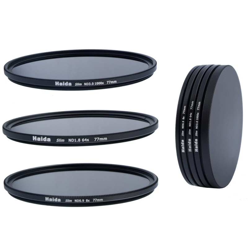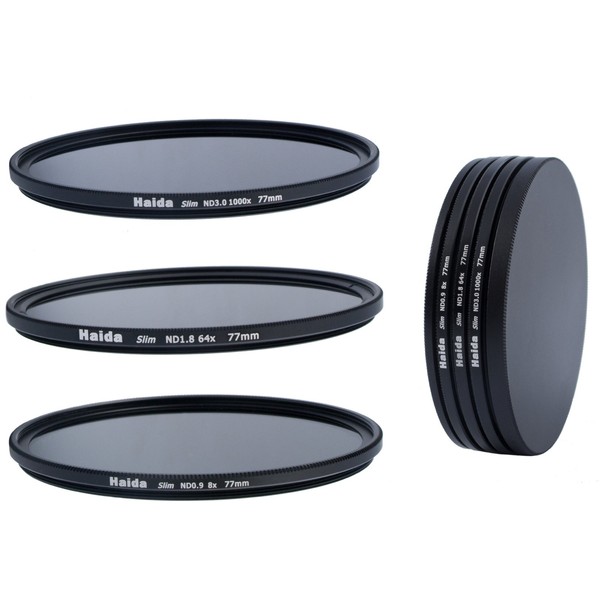 - High-quality slim neutral grey filter set 77 mm by Haida – made of high-quality optical glass – consisting of 3 filters: ND 8, ND64, ND1000 + filter container + lens cap with inner handle 77 mm
