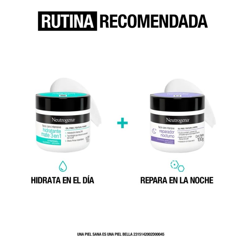 Crema hidratante en gel de Neutrogena Face Care Intensive con efecto duradero y fórmula avanzada, ofrece más ciencia a tu piel con una combinación de Colágeno y Niacinamida. Restaura durante la noche los daños diarios, previene las líneas de expresión, unifica el tono, corrige las marcas y ayuda a reafirmar la piel.