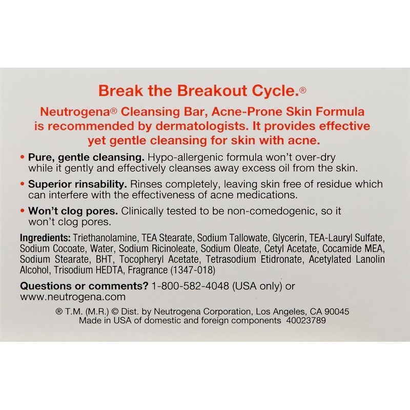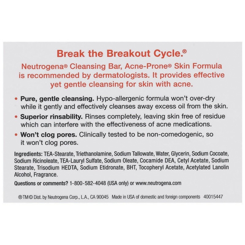 - 3.5-ounce Neutrogena Facial Cleansing Bar for Acne-Prone Skin that is specially formulated to provide gentle yet effective cleansing.