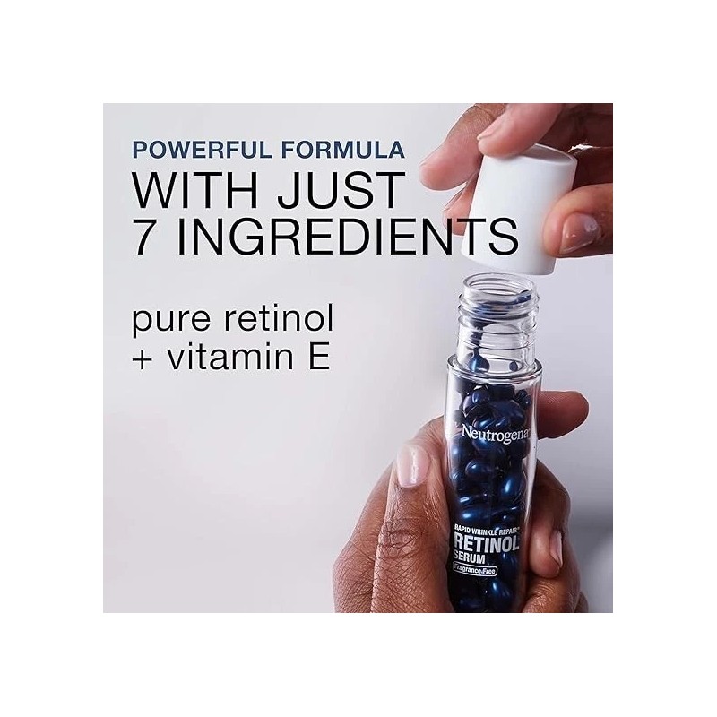 - 30-capsules of Neutrogena Rapid Wrinkle Repair Fragrance-Free Retinol Face Serum to target fine lines, dullness, wrinkles and skin elasticity while leaving skin feeling hydrated, nourished and plumper