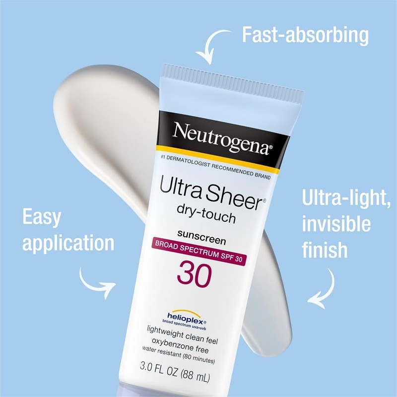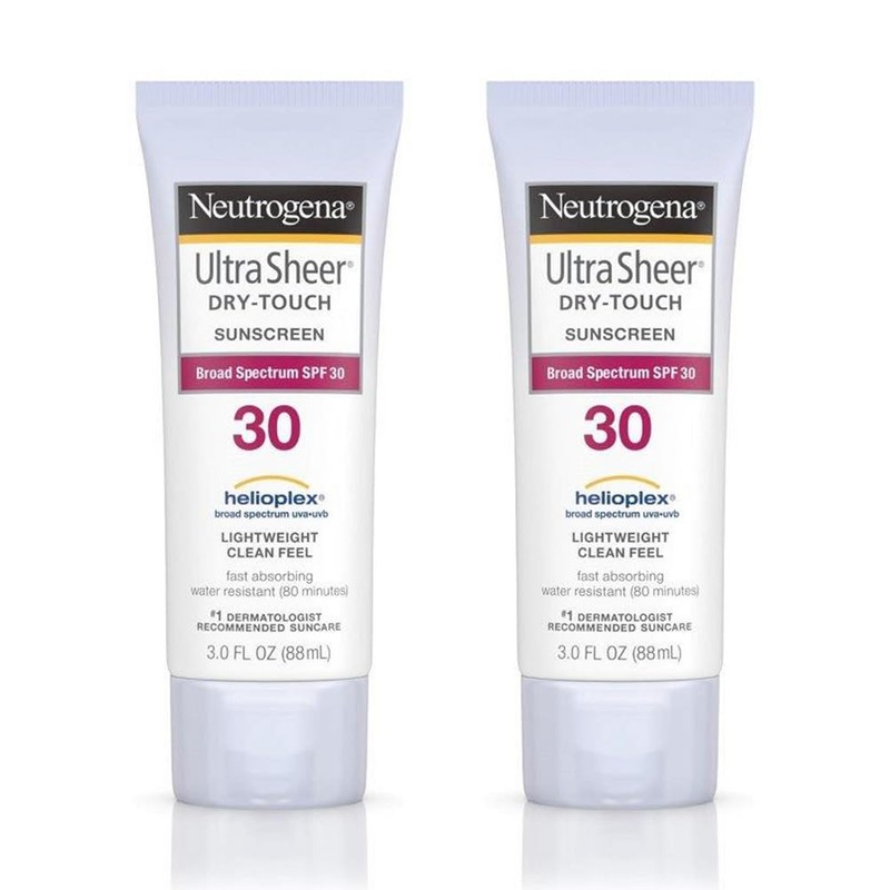 - 3-fluid ounce bottles of Neutrogena Ultra Sheer Dry-Touch Non-Greasy Sunscreen with SPF 30 that helps defend against the signs of sun aging, prevent sunburn, and decrease the risk of skin cancer when used as directed