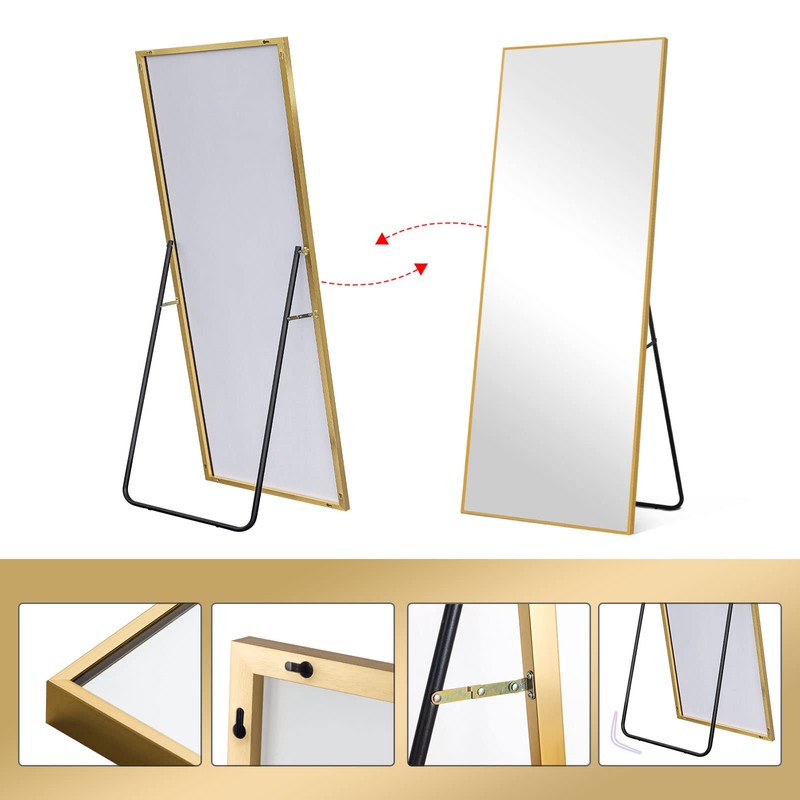 NeuType Full Length Mirror, 64" x 21" Aluminum Alloy Frame Floor Mirror with Stand, Large Bedroom Mirror, Free Standing or Wall Mounted or Leaning Against Wall, Gold