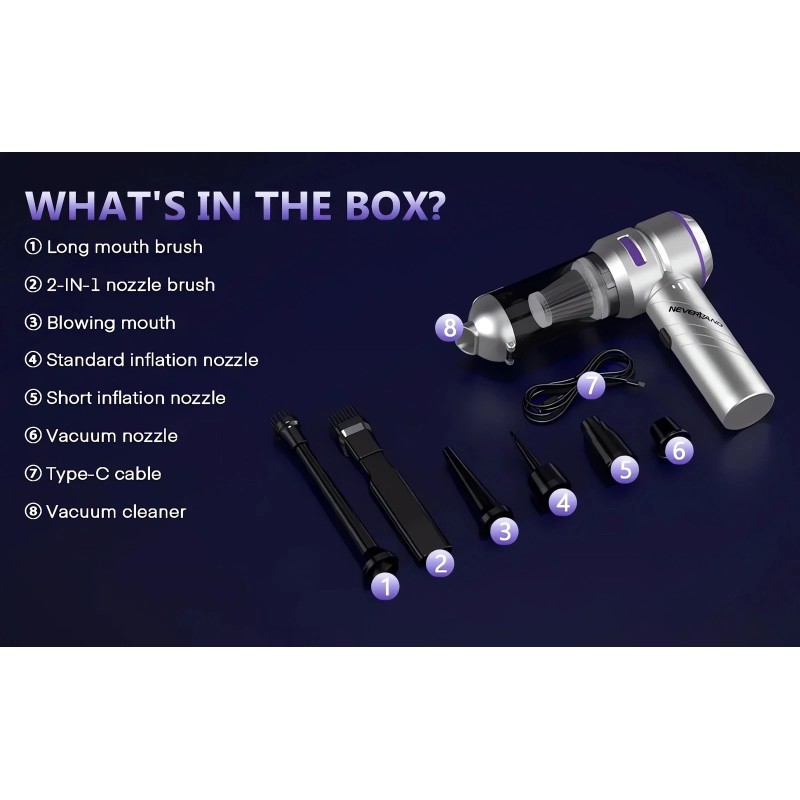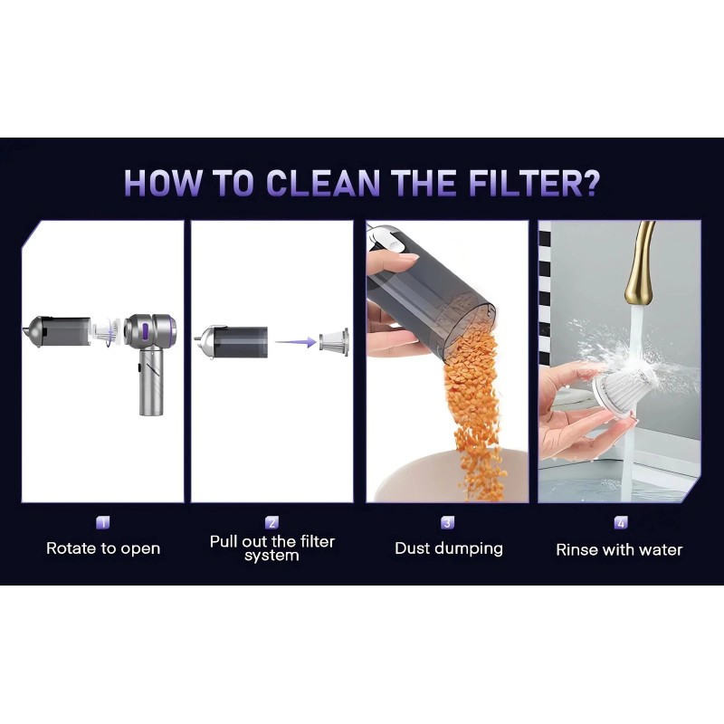 【Type-C Charging&Fast Charging】With a universal type-c charging cable, the handheld vacuum can be fully charged within 2.5 hours. Charge it in the car or charge with standard chargers, computers, or various storage devices.