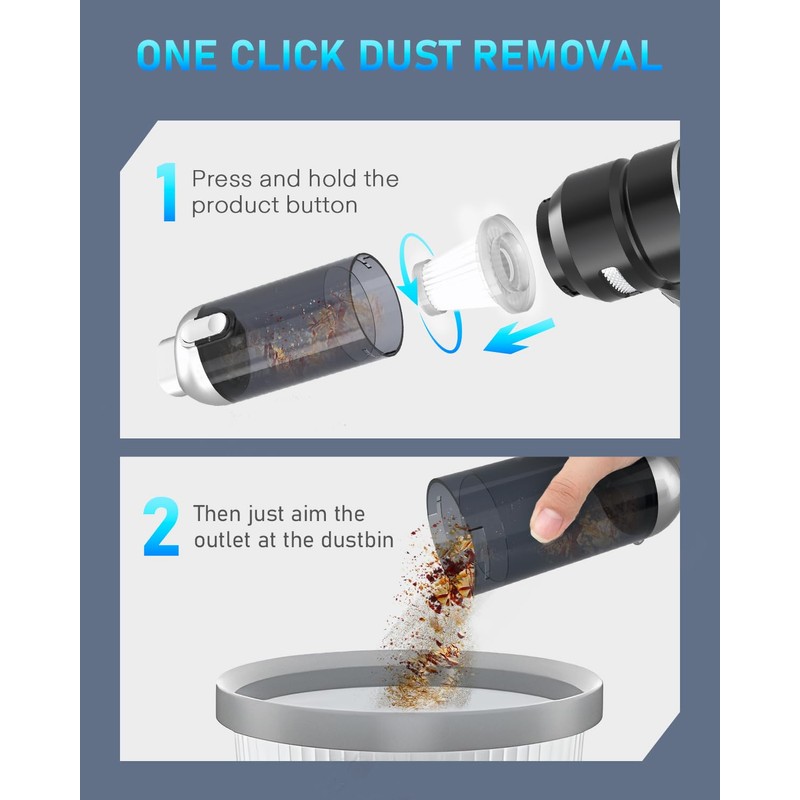 • 【Dual Filtration System】Our cordless hand vacuum has a dual filtration system. The first steel mesh filter is capable of filtering large particles of debris. The second is a washable and reusable HEPA filter, which can effectively filter fine particles and prevent damage to the motor.