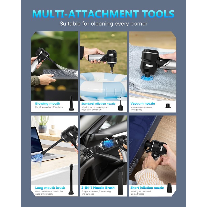 • 【4-IN-1 Car Vacuum】NEVERLAND handheld vacuum has 4 modes(with 6 nozzles/brushes), blowing, inflation, pumping and vacuum compression to meet your different needs. Blasts air to dislodge hidden debris from vents, keyboards, or car interiors, then vacuum it up. Mastery effortlessly picks up food crumbs, stubborn pet hair, dust, and sand from seats, carpets, and hard-to-reach gaps. Instantly inflates or deflate airbeds, pool floats, toys and more.
