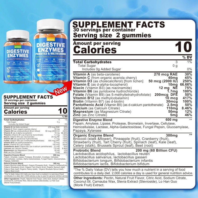 - Optimal Digestive Benefits: Our digestive enzyme gummies offer a unique blend of digestive enzymes, probiotics, and essential vitamins, delivering ultimate digestive support. This powerful formula promotes healthy digestion, enhances nutrient absorption, and alleviates discomfort caused by bloating and indigestion. With every delicious gummy, you’re taking a step toward a healthier gut, fortified with natural ingredients that synergize for optimal health!😄
