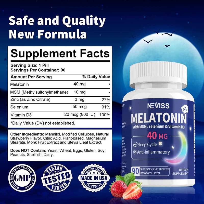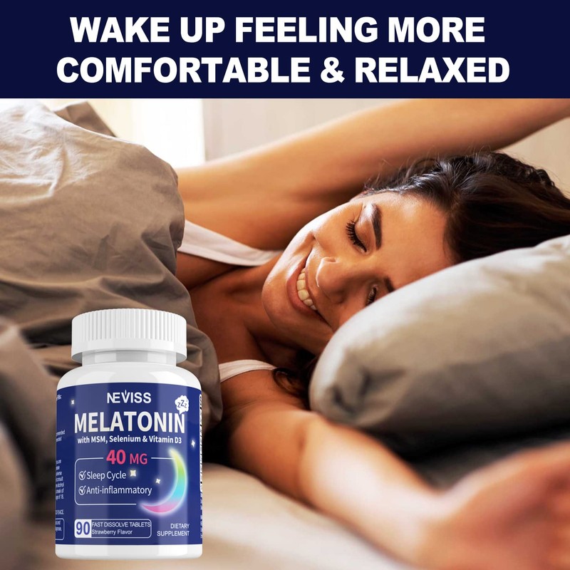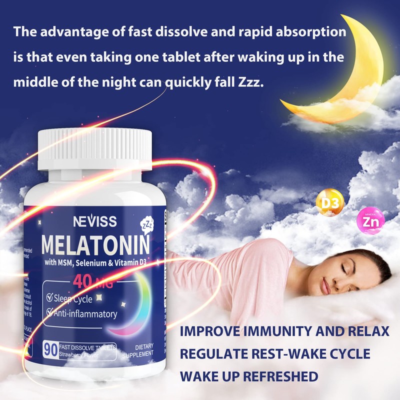 - Strongest Support: Fast dissolving pills, now with 40mg of maximum strength melatonin per serving! Melatonin is a popular ingredient for those seeking a natural Zzzz aid and this potent dose provides strong support for restful Zzzz. However, it's important to note that melatonin may cause drowsiness, so please consult with a medical practitioner before use and avoid operating machinery or driving after taking the tablet. With options for 20mg, 30mg, 40mg, and even 50mg, NEVISS has you covered.