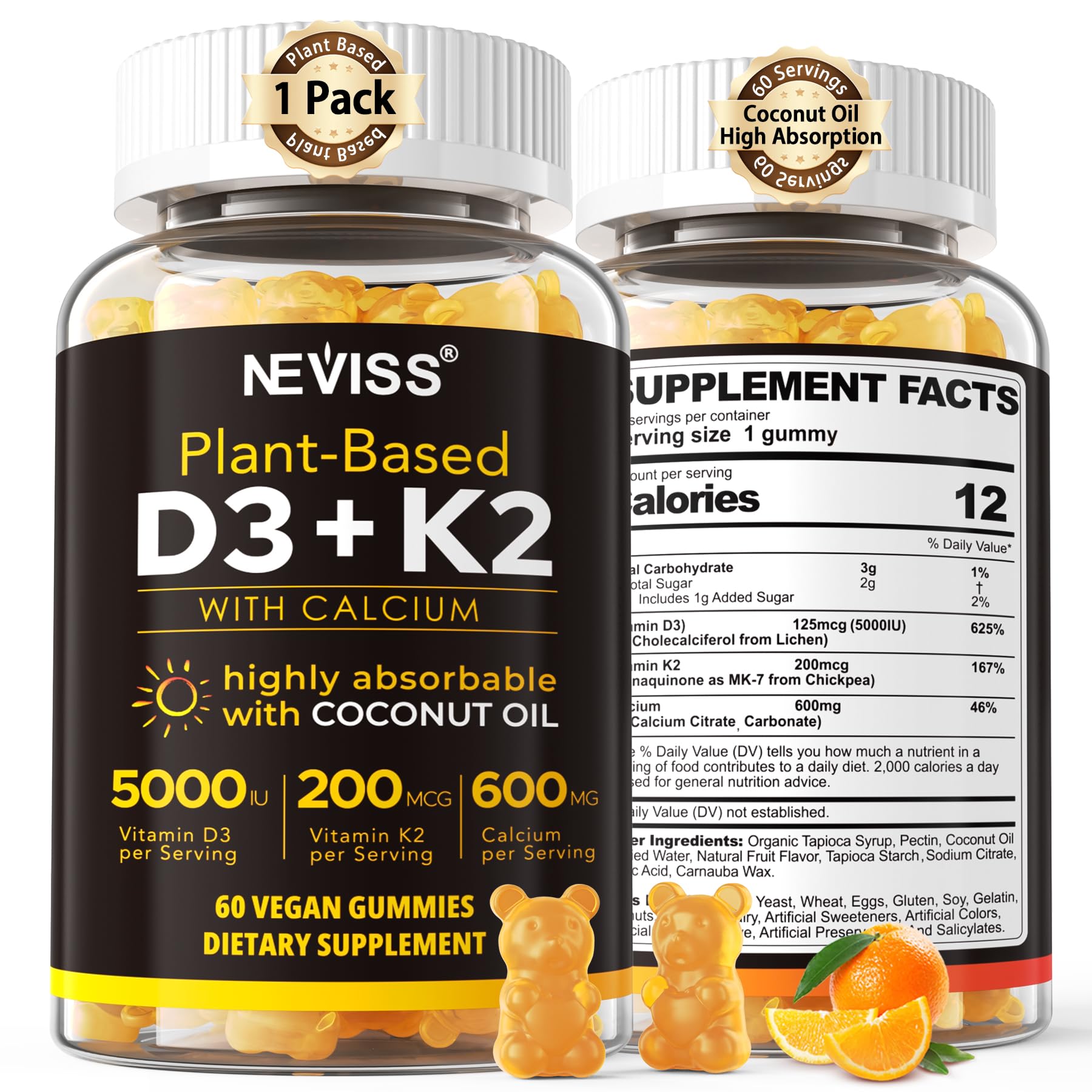 - PROUDLY MADE IN THE USA >>> NEVISS Vitamin D3K2 gummies 5000iu has a naturally delicious sweet orange flavor and with vitamin D3 from lichens and vitamin K2 from chickpeas in a plant-based gummies. Free of Animal Ingredients such as Lanolin and Bovine. Gelatin-free, dairy-free, soy-free, gluten-free. If you have any questions or are not satisfied, please contact us by email, we will get back to you as soon as possible!