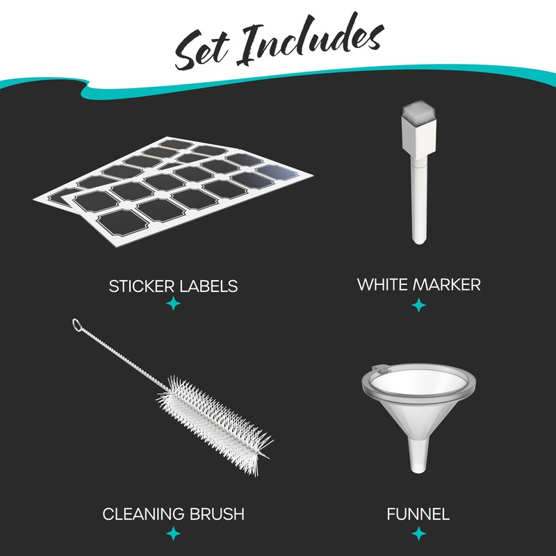 - Total 2 Oz Spray Bottle Mini Package: Get tthis complete package with 24 clear glass bottle spray & 24 mist tops for convenient misting. Label your small mist spray bottle set easily with chalkboard labels and a marker. Ensure easy cleaning with the included bottle spray brush. Refilling the mini mister spray bottles for oil & more is hassle-free with the included mini funnel. These versatile bottles can be used for oil spray for hair , coffee spritzer , face mist bottle , & more.
