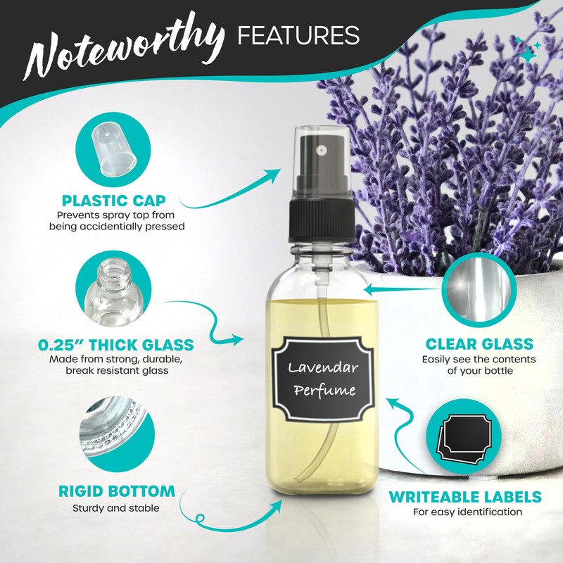- Premium Mist Bottle Sprayer : This 24 pack of Nevlers'atomizer spray bottle features a precise nozzle, secure seal, & clog-free design, delivering confidence in every spritz w/ our premium small glass spray bottles 2 oz set. These empty spray bottles are crafted from translucent glass, providing strength & easy identifiability. The mist bottle has a stable base that ensures it stands securely, plus clear glass that makes quick selection of your desired 2oz spray bottle simple!