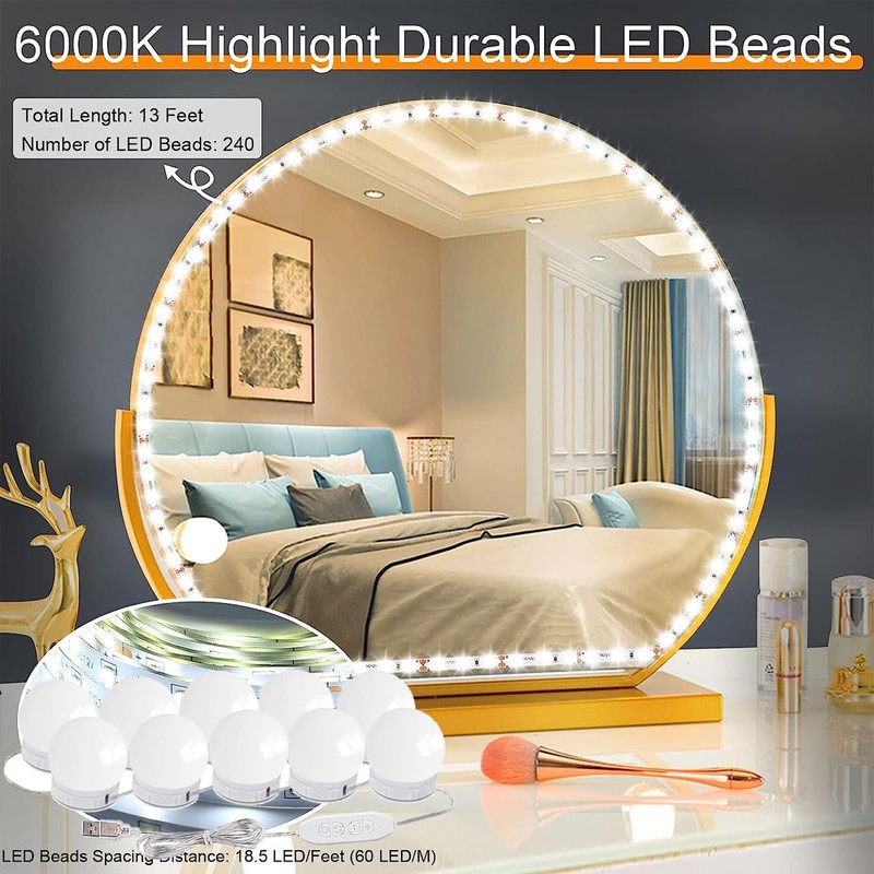 elf Beauty LED Make Up Vanity Mirror Lights The LED mirror lights is soft and not dazzling, your eyes will not be hurt by mirror lightS and no problem to makeup for a long time.Besides makeup mirror with lights is close to the daylight brightness so your skin color be showed naturally.