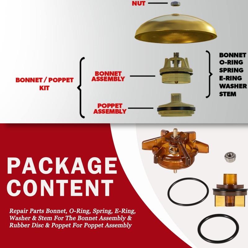 - ✅PACKAGE CONTENT: Repair Parts Bonnet, O-Ring, Spring, E-Ring, Washer & Stem For The Bonnet Assembly & Rubber Disc & Poppet For Poppet Assembly.