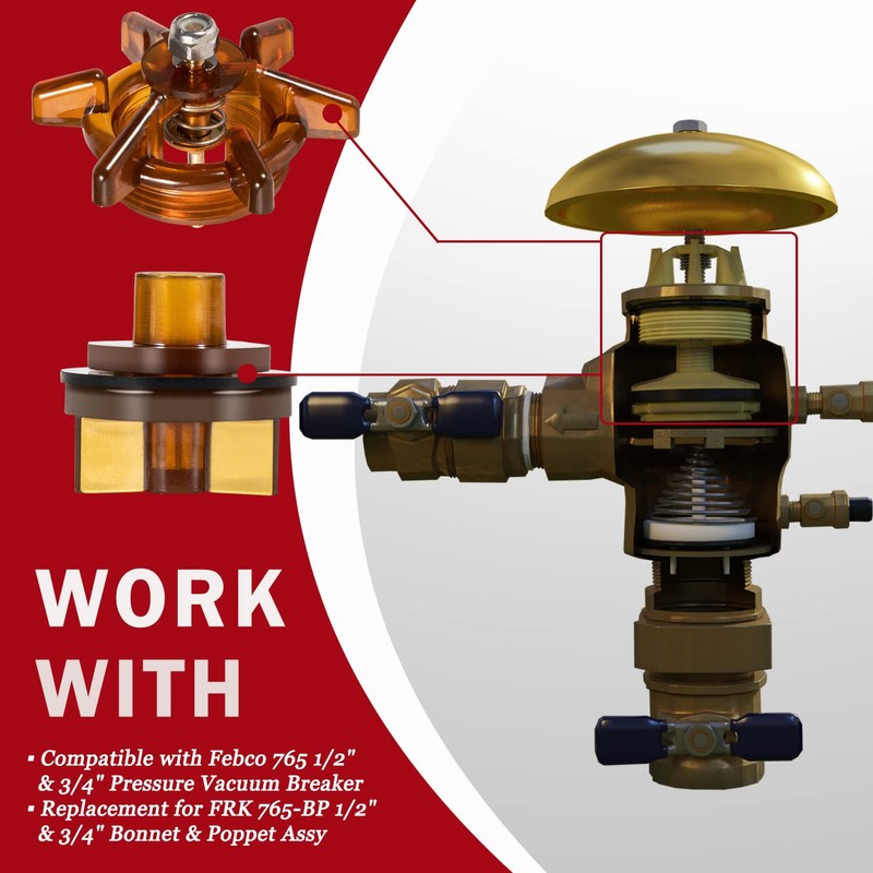 - ✅FIT ON: Compatible with Febco 765 1/2" & 3/4" Pressure Vacuum Breaker. Replacement for FRK 765-BP 1/2" & 3/4" Bonnet & Poppet Assy.