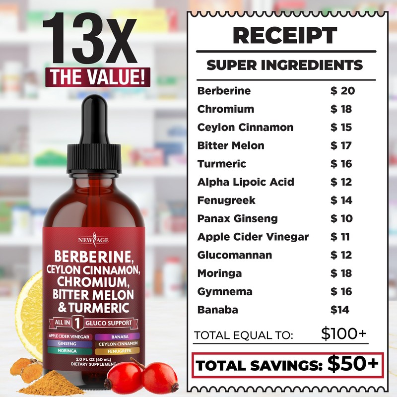 Berberine with Ceylon Cinnamon Supplement Liquid Drops + Bitter Melon Extract, Glucomannan, Gymnema, Chromium, Turmeric, Panax Ginseng, Moringa- 4 OZ