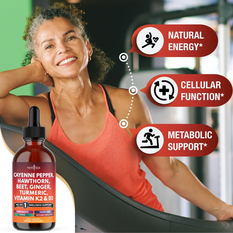 - New Age All-in-One Supplement Cayenne Pepper Liquid Drops – A potent combination of traditional herbs and essential vitamins, including organic Ceylon cinnamon, hawthorn berry extract, beetroot, turmeric, K2 D3 vitamins, ginseng, and berberine with Ceylon cinnamon. These vegetarian liquid drops deliver a concentrated plant-based formula designed to promote daily health and overall well-being.