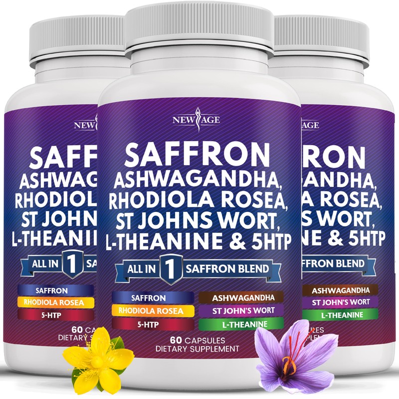 NEW AGE Saffron Supplements with Ashwagandha - Support with L-Theanine, Ginkgo Biloba, St. John's Wort, Rhodiola Rosea & 5-HTP - Saffron 180 Count