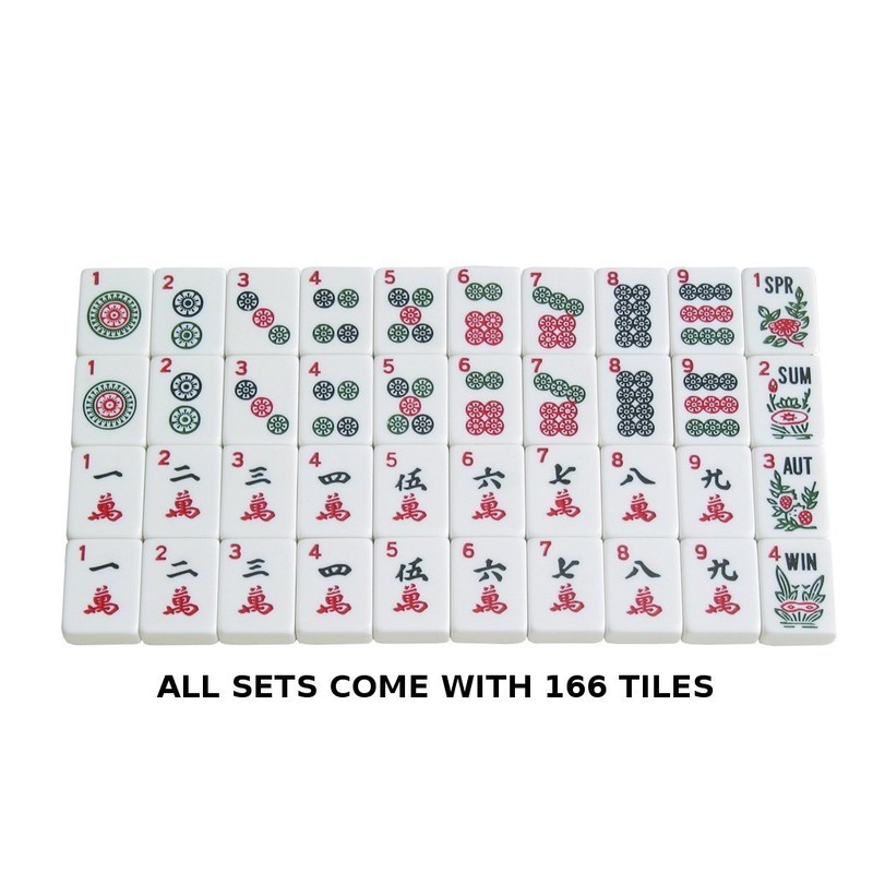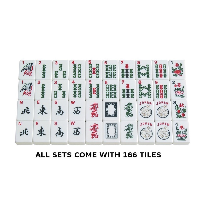 - 166 premium tiles: 36 Dots, 36 Bams, 36 Cracks, 12 Dragons, 16 Winds, 16 Flowers, 10 Jokers, and 4 Blank Spares, each tile measuring 1-3/16" tall x 7/8" wide x 1/2" thick (30mm x 23mm x 13mm)