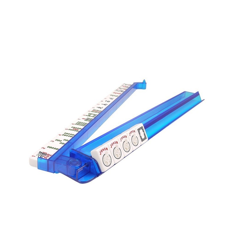 - Includes 4 stunning sapphire blue all-in-one pusher and tile rack combo, so easy to use and so easy to put away after game play. Each set comes with 3 large dice (5/8" size), 100 money chips, and bettor (please check inside zippered pocket for these accessories)