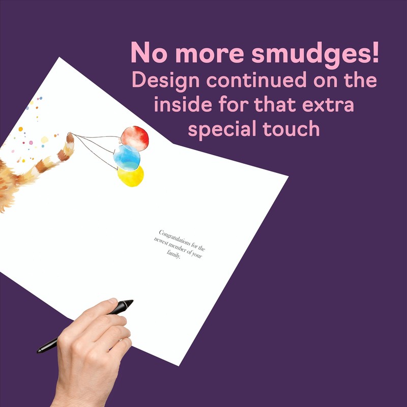 - What's Inside - Print showcasing a lovely verse, 'Congratulations for the newest member of your family' as seen in the second image. There's ample space for your own personal message. Crafted on a 360-micron thick environmentally responsible board, this one-sided gloss board offers a luxurious look and feel. Paired with a colored gummed envelope that complements the design, it's ready to be sealed and sent, making it a truly special congrats gesture.