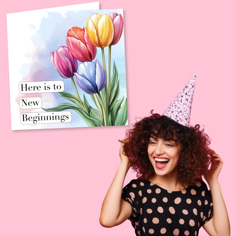 New Beginnings Card for a Special Someone - Here Is To New Beginnings - Tulips, Watercolour, Flower Lover, Fresh Start - For a Friend, Best Friend, Loved One, Partner, Relative, Colleague
