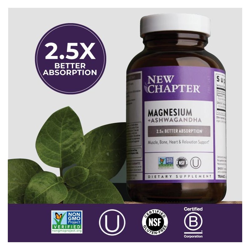 - New Chapter Magnesium + Ashwagandha Supplement | 325 mg with Magnesium Glycinate, 2.5x Absorption, Muscle Recovery, Heart, Bone Health & Relaxation