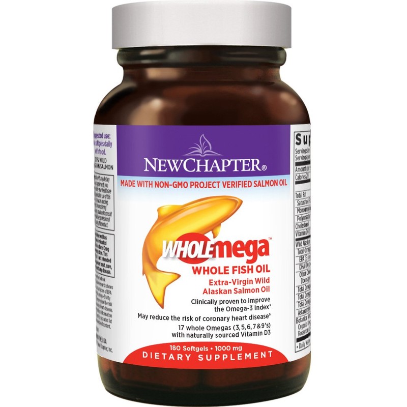 New Chapter's Wholemega Fish Oil Supplements have been clinically shown to improve the Omega 3 Index in just 2 weeks. Wholemega Salmon Oil delivers 17 Omega fatty acids (including vital Omega 3s) and naturally occurring Vitamin D3. Contains 100% sustainably caught Wild Alaskan Salmon to help solve the severe environmental problems caused by typical overfishing and ocean trawling. Made with Non GMO Project Verified salmon oil: No krill oil, no anchovies or sardines, no cod liver oil, no exploited fisheries, no farmed fish. (Packaging May Vary) *These statements have not been evaluated by the Food and Drug Administration. This product is not intended to diagnose, treat, cure or prevent any disease.