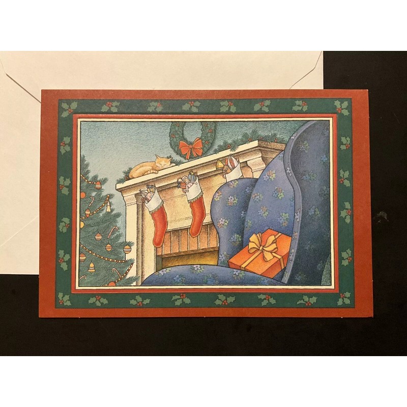 NEW Christmas Greeting Card Fireplace Mantel Hanging Stockings Xmas Tree Wreath
