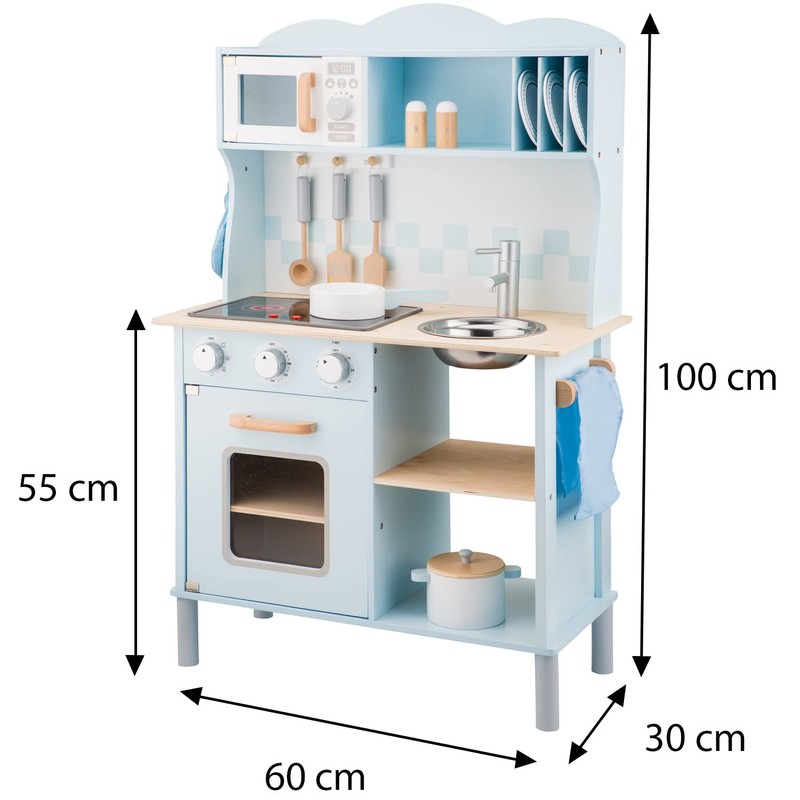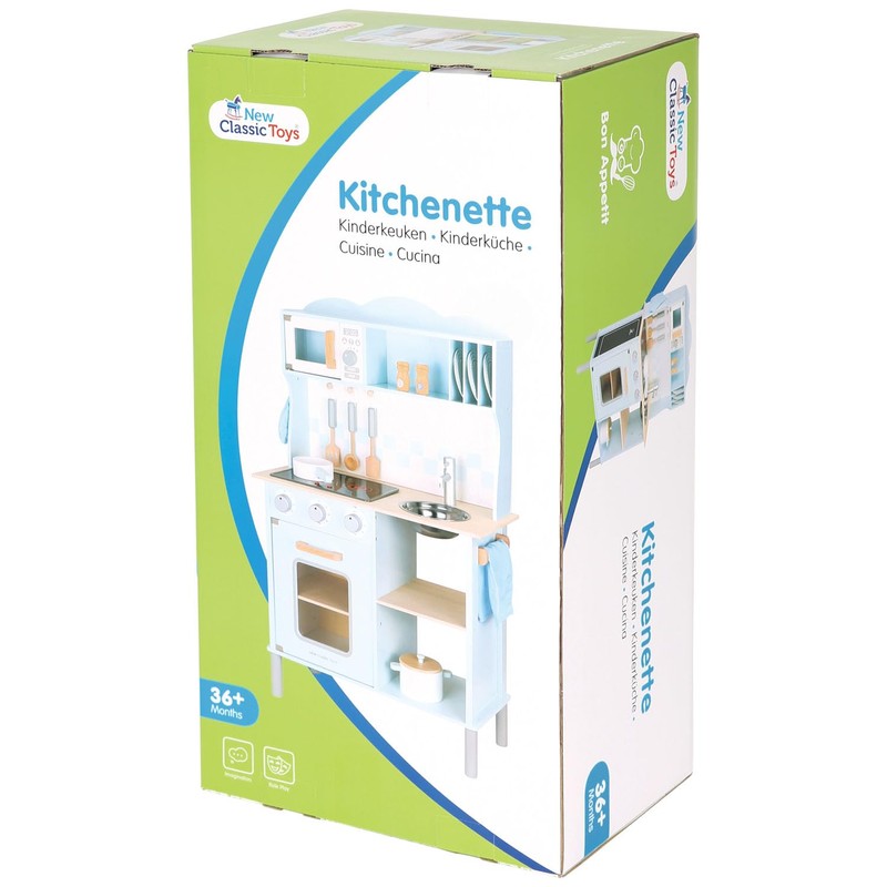New Classic Toys Blue Wooden Pretend Play Toy Kitchen for Kids with Role Play Bon Appetit Electric Cooking Included Accesoires Makes Sound