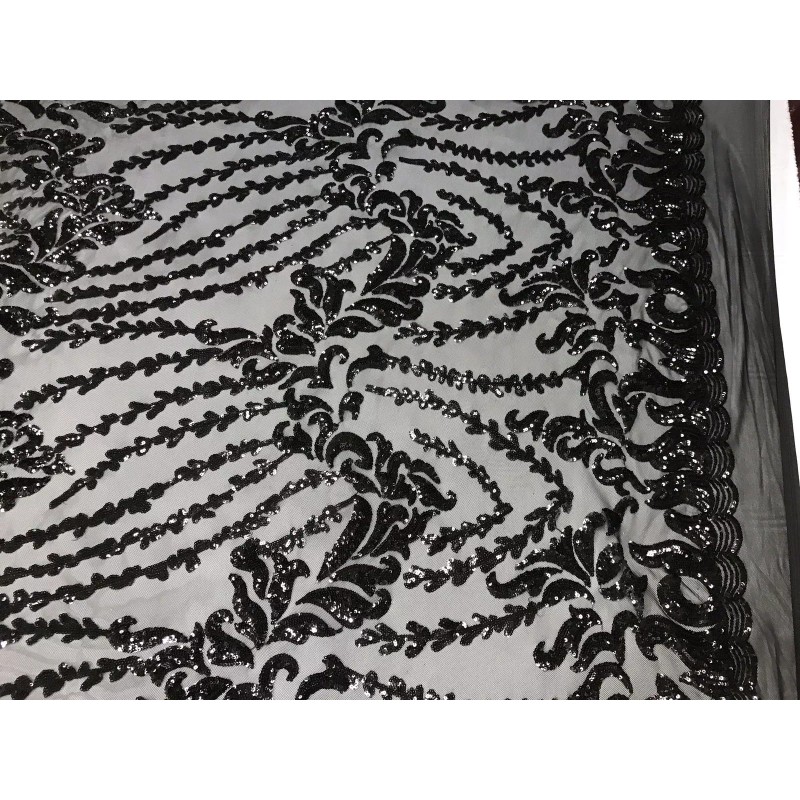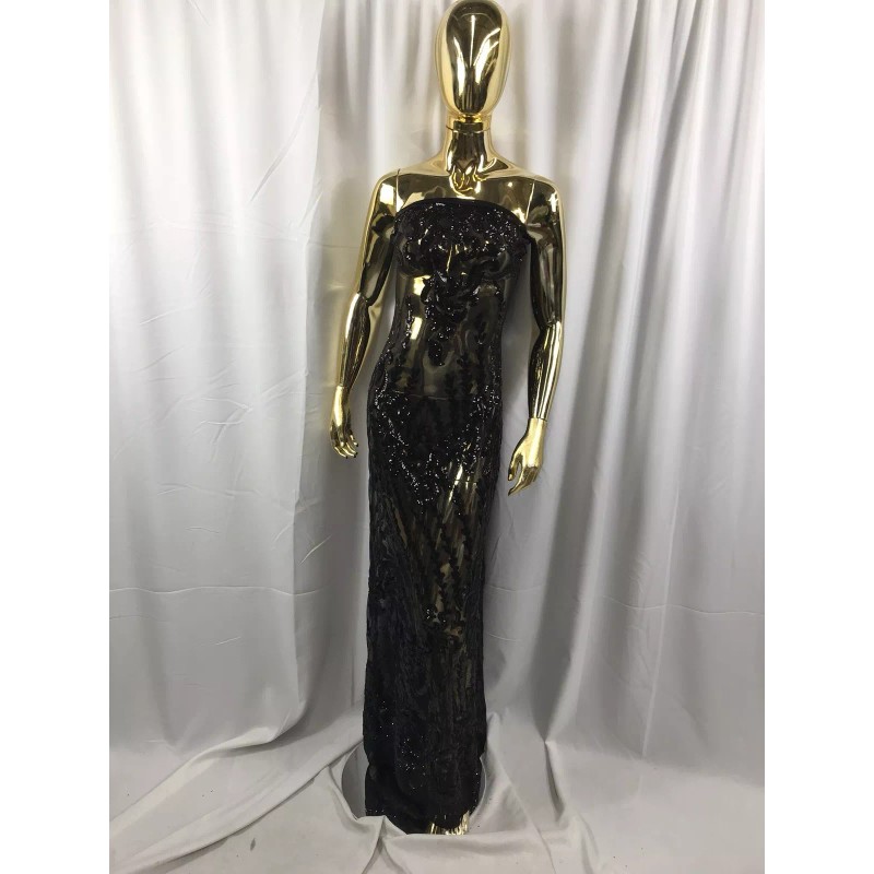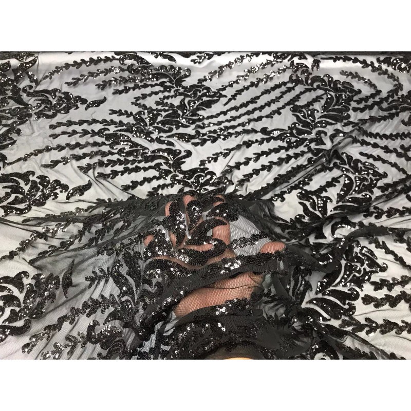This design is embroidered with Sequins on a 4 Way Stretch power mesh fabric. The Sequins has especial and extraordinary design on the Mesh . It is super elegant and classy, The design embroider with Sequins on a power mesh can be use for dresses, tablecloths, night gowns, Skirts, prom dresses, wedding dresses, runners for tables,decoration and much more.