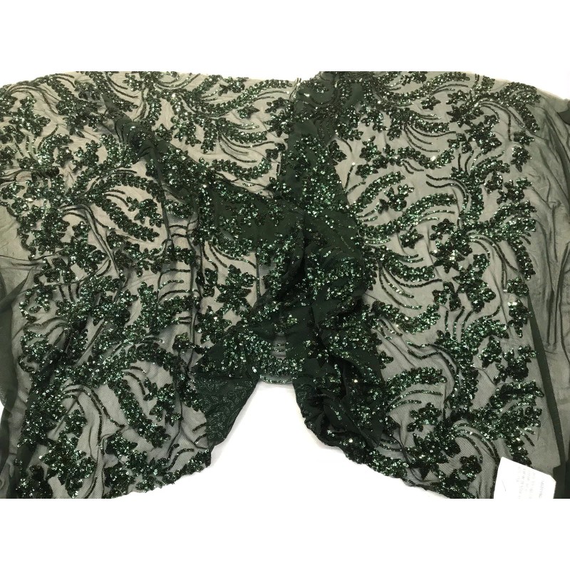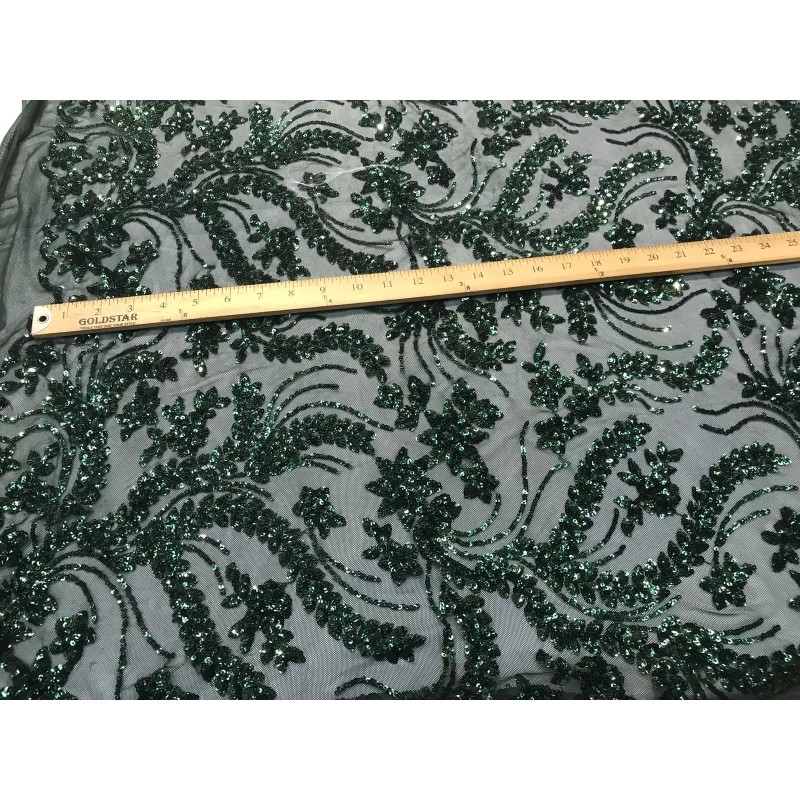 NEW CREATIONS FABRIC AND FOAM INC HUNTER GREEN SEQUINS VINES DESIGN EMBROIDERY ON A 4 WAY STRETCH MESH-BY THE YARD