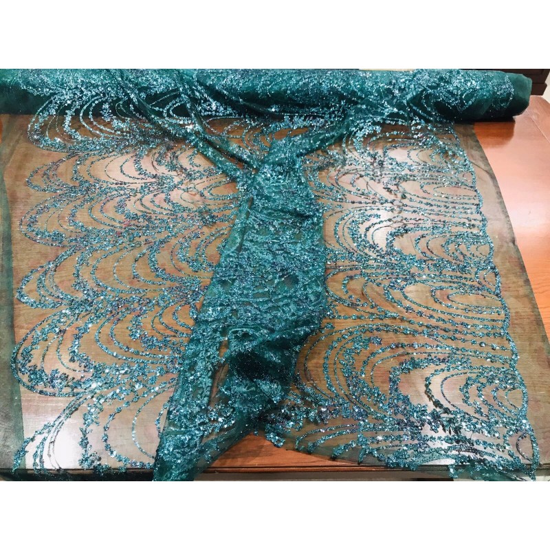 NEW CREATIONS FABRIC AND FOAM INC HUNTER GREEN SHINY GLITTER WAVE DESIGN ON A printed MESH-PROM-SOLD BY THE YARD.