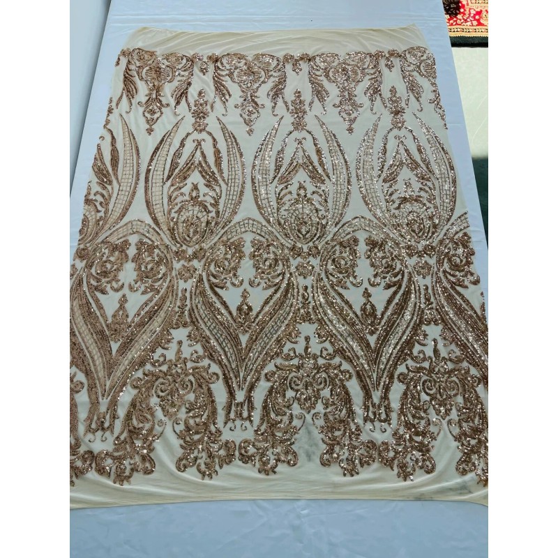 New Creations Fabric & Foam Big Damask Sequins - Champagne Damask Sequins Design 4 Way Stretch Mesh Yard
