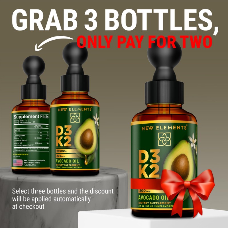 New Elements Liquid Vitamin D3 + K2 (MK-7) Drops 10,000 IU – High Absorption for Bone & Immune Support | Non-GMO, Avocado Oil Base | Promotes Strong Bones, Heart & Immune Health | 2 fl oz (60 ml)