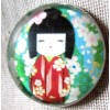 NEW GLASS DOME PIC BUTTON - JAPANESE KOKESHI DOLL IN RED W WHITE CHERRY BLOSSOMS
