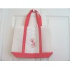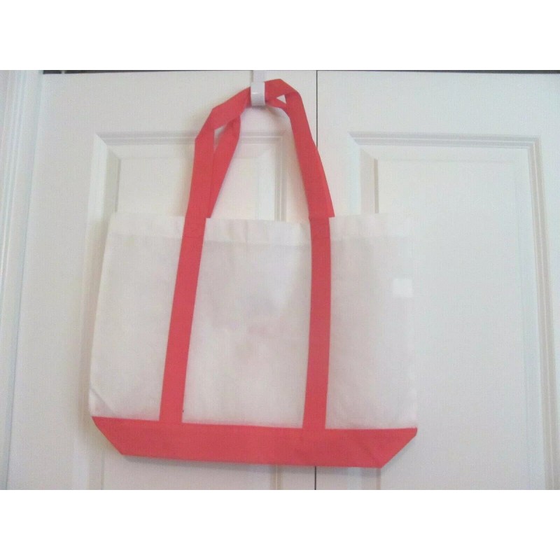 THE BAG IS WHITE WITH RED TRIM, RED PRINT AND RED SHOULDER STRAPS