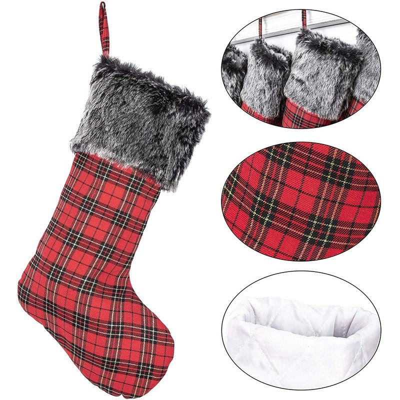 - Festive appearance: These stockings feature plaid pattern and long faux fur cuff design, classic and festive color, cute and adorable in appearance, Christmas gifts are ready to be stuffed in for whole family. Notice: Six in a pack.