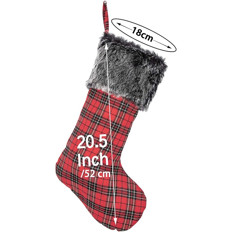 - Material and size: These plaid Christmas stockings are made of quality cloth and faux fur with fine workmanship, durable and long-lasting to use, the plush cuff will present a comfortable and warm look; Size: approx. 48 cm/ 19 inch, enough capacity to hold many small gifts