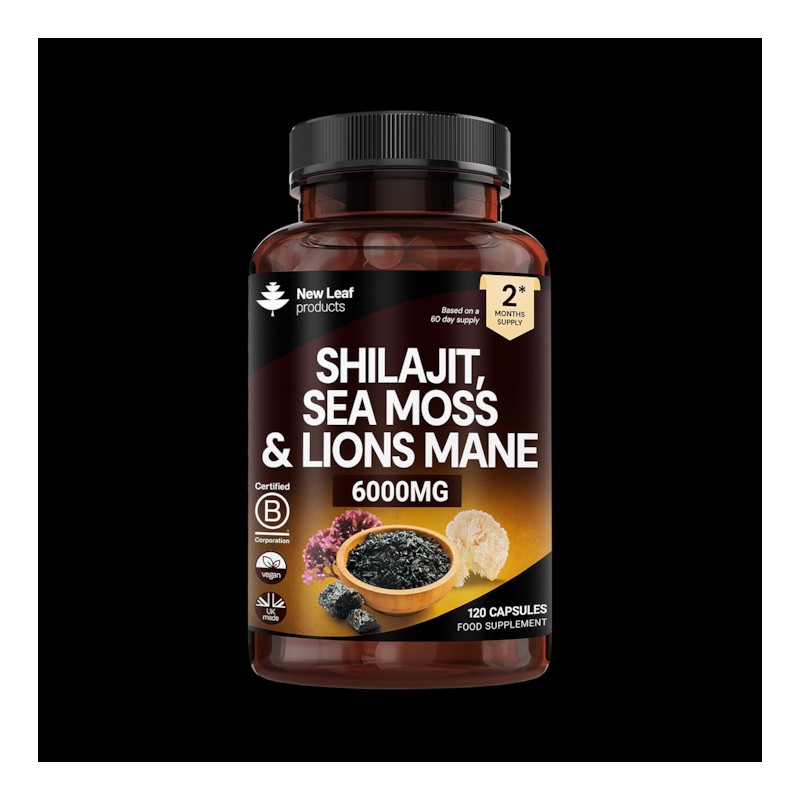 SHILAJIT, SEA MOSS & LIONS MANE CAPSULES - New Leaf’s Shilajit, Sea Moss & Lions Mane Capsules provide 6000mg per serving. This natural ingredient is formed over centuries from plant decomposition. With 120 capsules, this supplement offers a two-month supply.