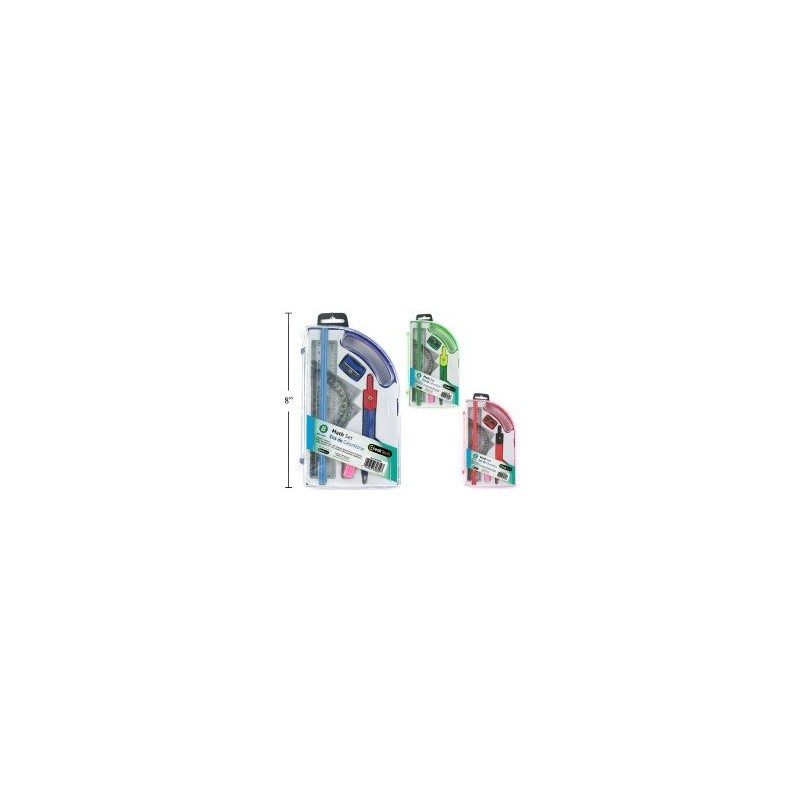 Set includes: 6" transparent ruler 45/90 triangle ruler 30/60/90 triangle ruler 180 protractor Mechanical Pencil Compass with pencil lock Mechanical Pencil Eraser Sharpener Plastic Case (Dimensions: 7.2"x 4.8"x .8")