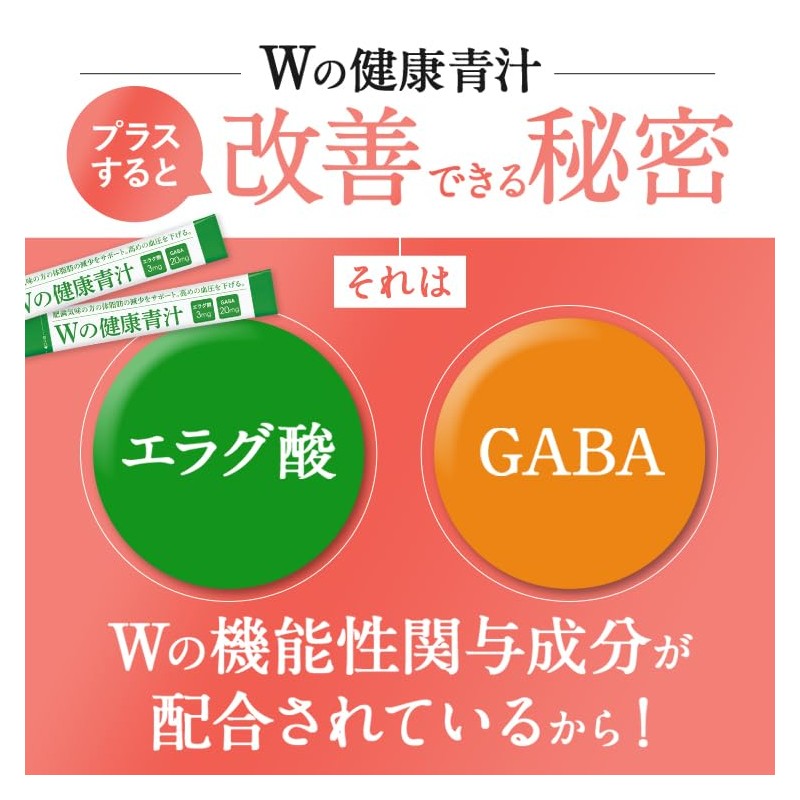 - W Health Juice is a food with function label that contains green juice that allows you to take nutrition of vegetables, and "Eragic Acid" which supports the reduction of neutral fat in obesity and GABA which has the function of lowering high blood pressure. It is a blend of barley and waken leaves, tomoraya, mulberry leaves, and is developed to keep you clean and easy to drink, but also with clear intention. This green juice is recommended for everyday health habits