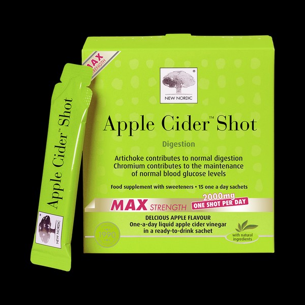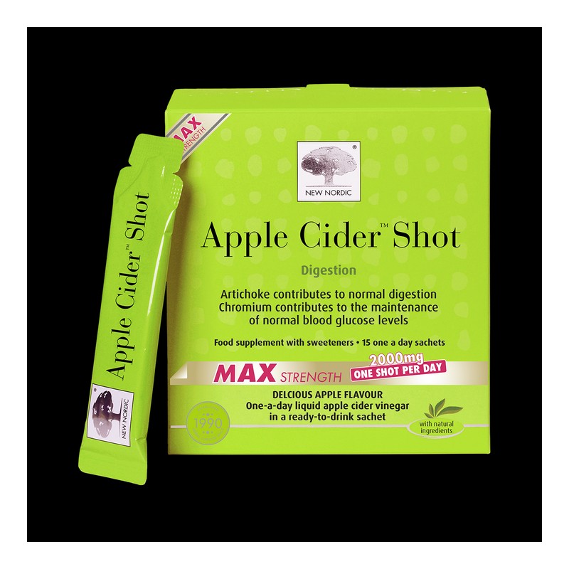 Apple Cider™ Shot is a premium liquid apple cider sachet, pre-mixed with an apple taste and formulated in the perfect dose to fit in effortlessly with your daily routine. Apple Cider™ Shot combines apple cider vinegar, artichoke, dandelion, and chromium. Chromium contributes to the maintenance of normal blood glucose levels.
