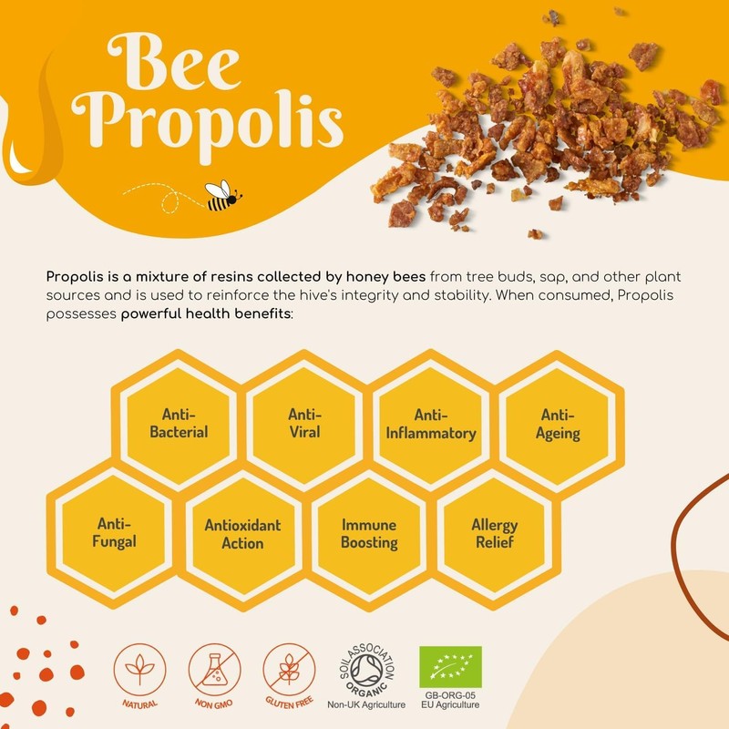 - 🐝 ZERO ADDITIVES, UK MANUFACTURED TO GMP STANDARDS. We believe in clean nutrition which is why you won't find any nasty stuff in our products such as fillers, binders and flow agents. Our Organic Bee Propolis capsules are manufactured in the UK to GMP quality assurance with only the finest quality raw materials.