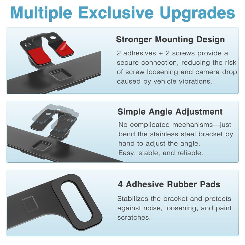 The upgraded universal license plate camera mount holder now equipped with reinforced screws and strong adhesive tape, ensuring double the stability. With this reverse camera mount, no matter the bumpy road, harsh weather, or high-pressure car washes, your reverse camera stays securely in place with a perfect viewing angle.
