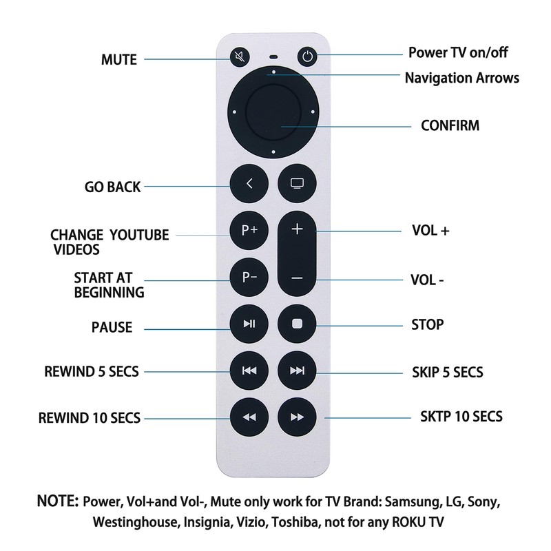 • The Apple tv remote also works with TVs: Samsung,LG,Sony,Westinghouse,Insignia,Vizio,Toshiba,not for any ROKU TV.
