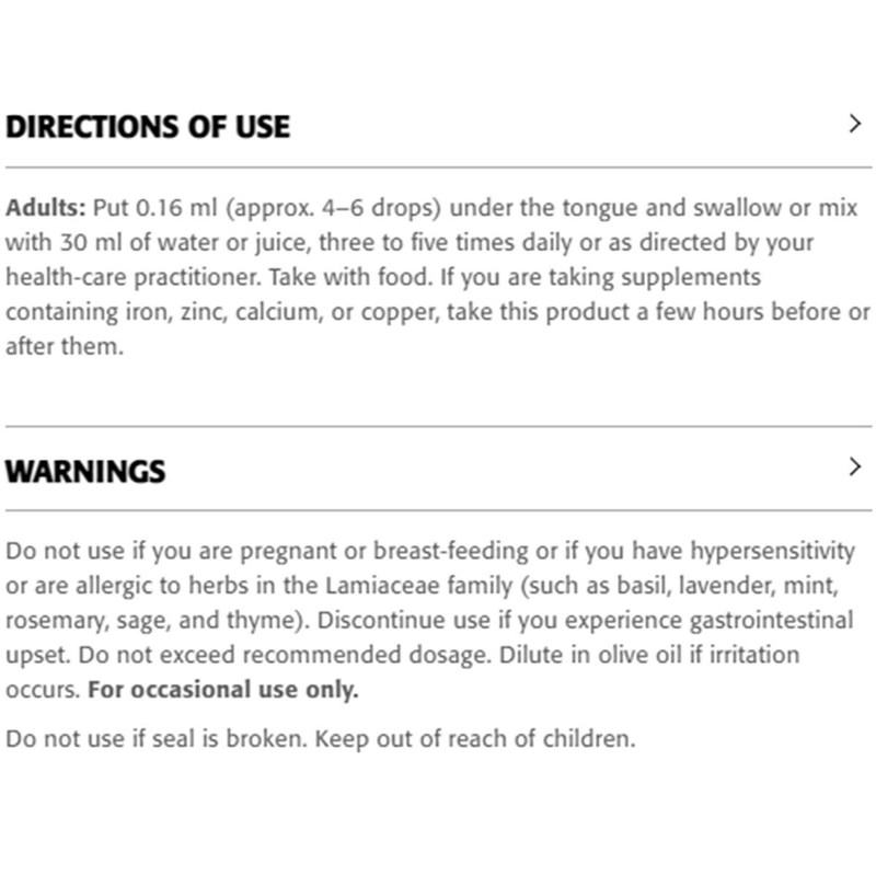 Do not use if you are pregnant or breast-feeding or if you have hypersensitivity or are allergic to herbs in the Lamiaceae family (such as basil, lavender, mint, rosemary, sage, and thyme). Discontinue use if you experience gastrointestinal upset. Do not exceed recommended dosage. Dilute in olive oil if irritation occurs. For occasional use only.