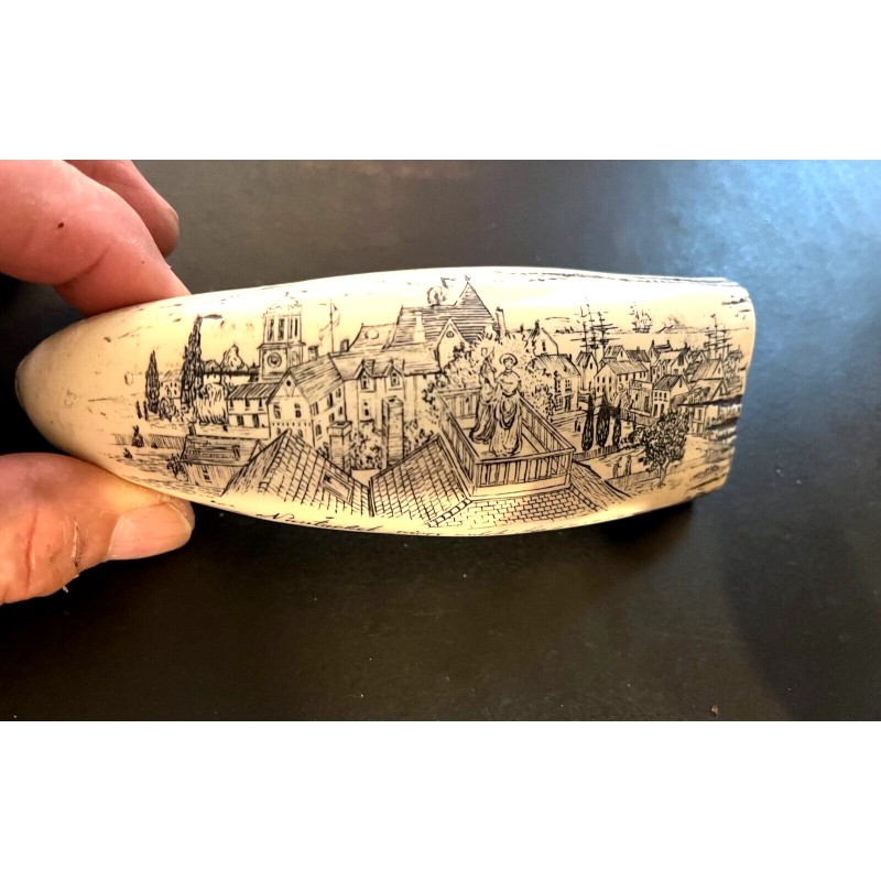 NEW !! Scrimshaw whale tooth resin REPLICA "NANTUCKET WIVES" 6" long 7" on curve