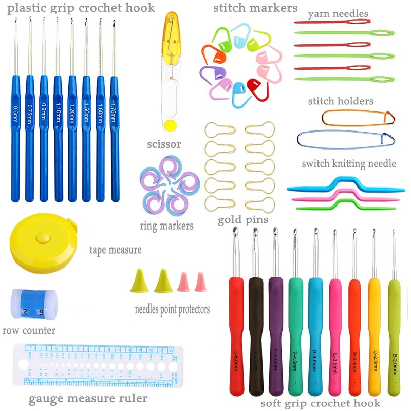 - COMPREHENSIVE CROCHET HOOKS SETS KIT.Each kit contains 8 blue plastic handle hooks & 9 colorful silicone handles hooks and 47pcs accessories. it met your any need.Best choice for beginners and professionals crocheter.