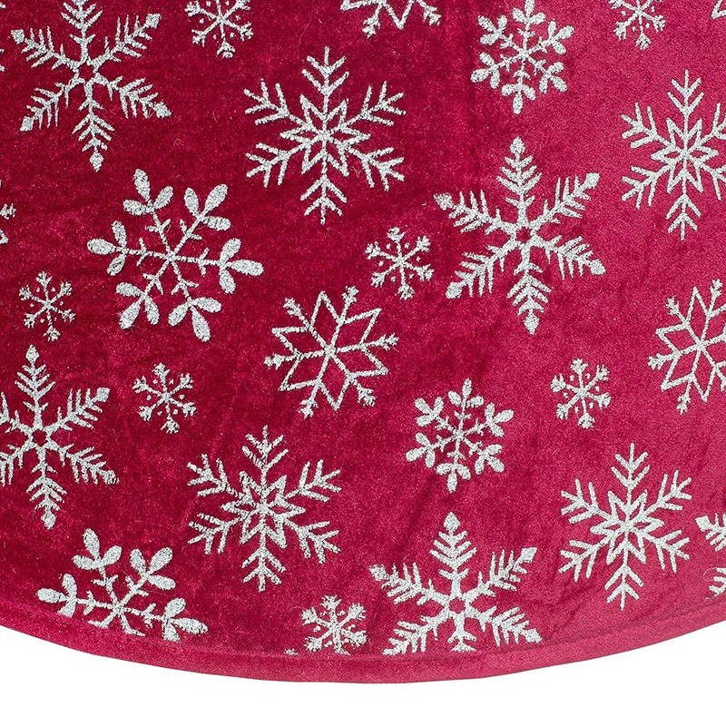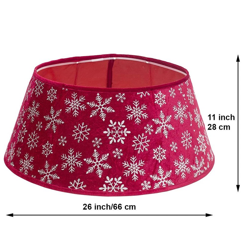 - Christmas tree collar is made from classic red velvet material, decorated with glittery silver snowflakes, and trimmed with solid red velvet edging. Very easy to assemble – just insert two plastic tubes into the top and bottom of the tree stand collar